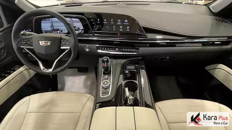 طراحی داخلی کادیلاک اسکالید نمادی از لوکسگرایی مدرن و توجه دقیق به جزئیات است؛ فضایی که در همان نگاه اول حس قدرت، آرامش و کیفیت را به سرنشینان منتقل میکند. داشبورد دیجیتال پیشرفته و نمایشگر بزرگ بهصورت یکپارچه اطلاعات رانندگی، سیستم سرگرمی و تنظیمات خودرو را نمایش میدهد. استفاده از متریال باکیفیت، نقش مهمی در لوکس بودن فضای داخلی این خودرو دارد. چرم های طبیعی مرغوب، تریمهای چوبی یا فلزی ظریف و دوختهای دقیق، نشاندهنده توجه ویژه کادیلاک به کیفیت ساخت هستند.
